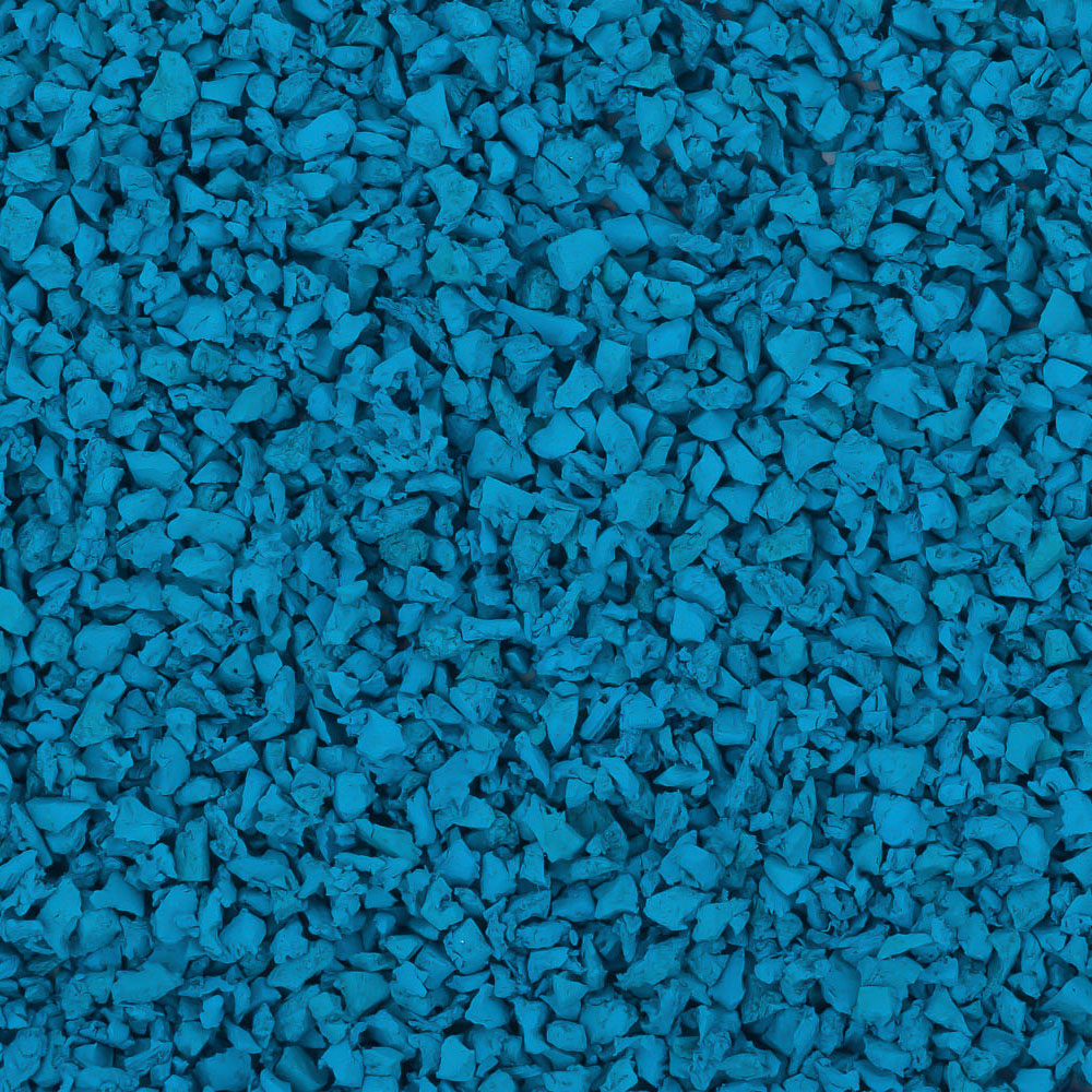 Крашеная крошка цвета небесный синий. Получена путем поверхностного окрашивания резиновой черной крошки. Красиво выглядит на детских площадках при создании рисунков морской тематики, а также эффектно сочетается в миксах с голубым цветом.
